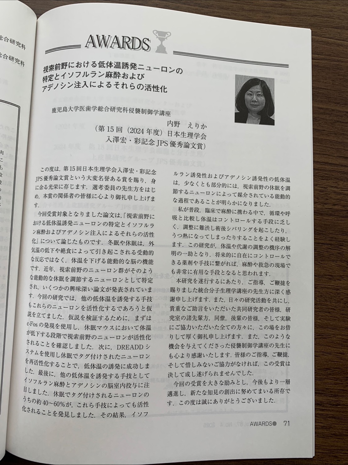 内野えりか先生が第15回日本生理学会 入澤宏・彩記念JPS優秀論文賞を受賞しました! 2025/11/27 内野えりか先生が、このたび 第15回 日本生理学会 入澤宏・彩記念 JPS 優秀論文賞 を受賞されました。 受賞論文は 『日本生理学雑誌』 に掲載されております。