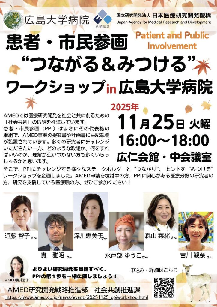 このたび、AMED主催により、PPIを学び・体験するワークショップを広島大学にて開催いたします。